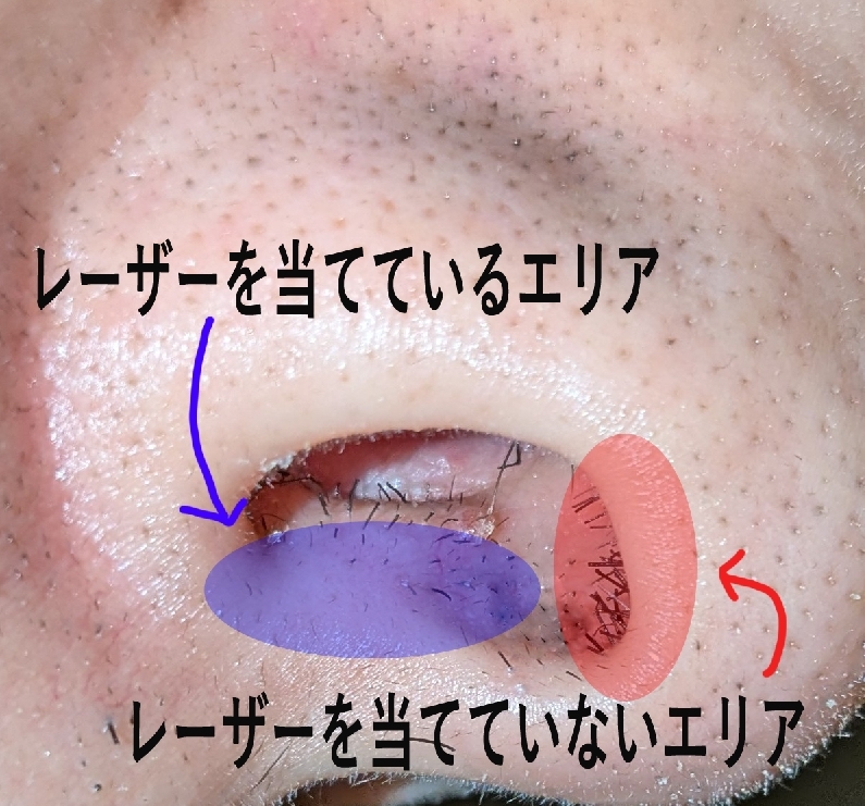 私的に、赤エリアも脱毛してよいかなと思い始めているのですが、鼻毛のフィルター機能が失われるのが怖くて、今はしていません。ただ、今の状態でもある程度満足しています。もう半年ぐらい根気よく続ければ、ほとんど生えてこなくなるのではと期待しています。
