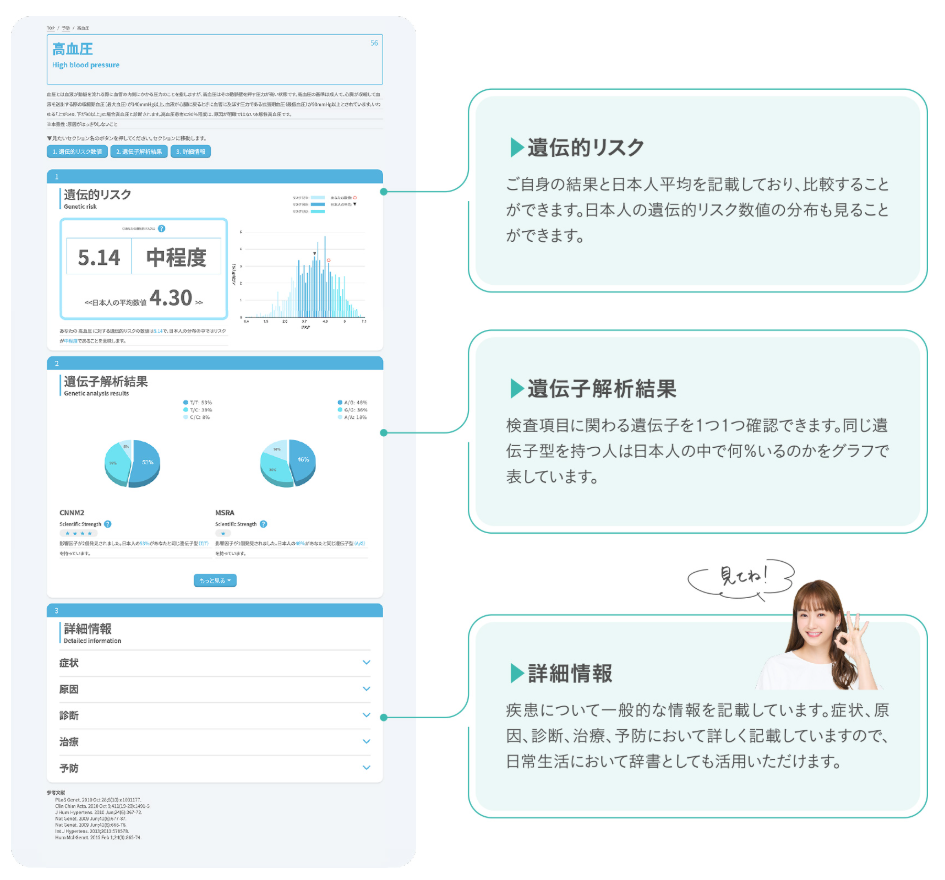 これらの項目はすでにどの遺伝子がどのように変異しているか調べることでわかります。それ以外の項目についても、相関関係がはっきりとはしていないだけで、その根拠自体が否定されているわけではありません。調べてみて、自分なりの解釈で、健康を把握することはよいことでしょう。