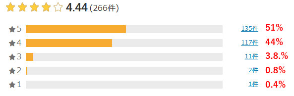 なんと、5段階中、4.19と高評価でした。こちらは、Amazonのレビューとほとんど同じという評価で、サクラレビューは極めて少ないという結果になります。